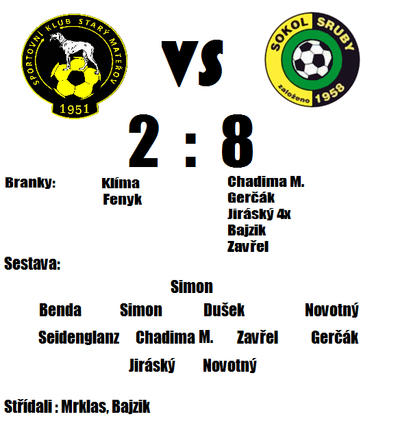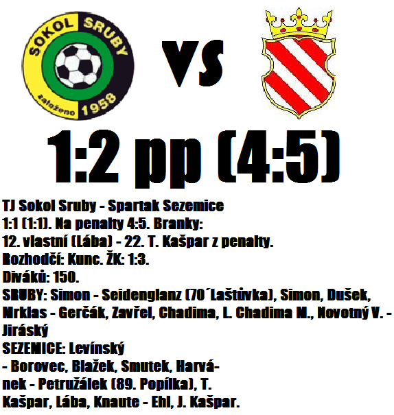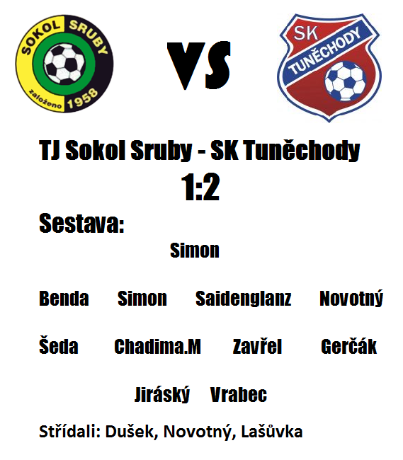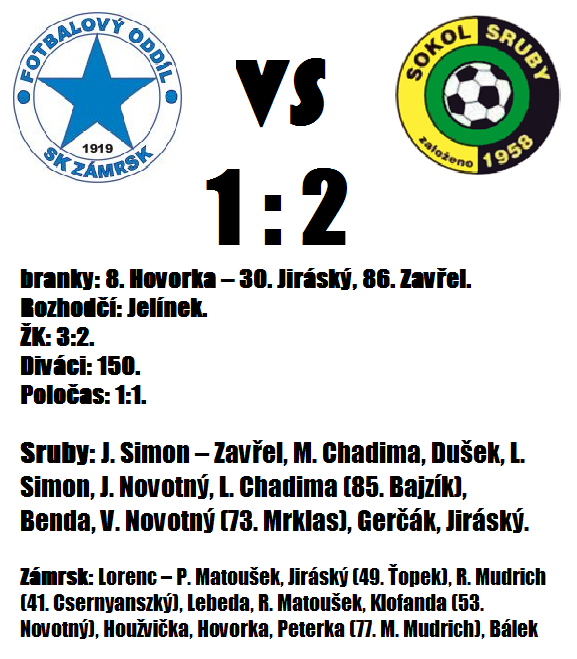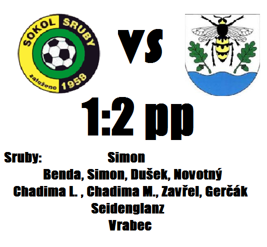 SRUBY: Simon - Benda (63. Mrklas), Simon, Dušek, Novotný - Novotný V., Chadima M., Chadima L. (80. Laštůvka), Zavřel, Gerčák - Jiráský (89. Šeda)